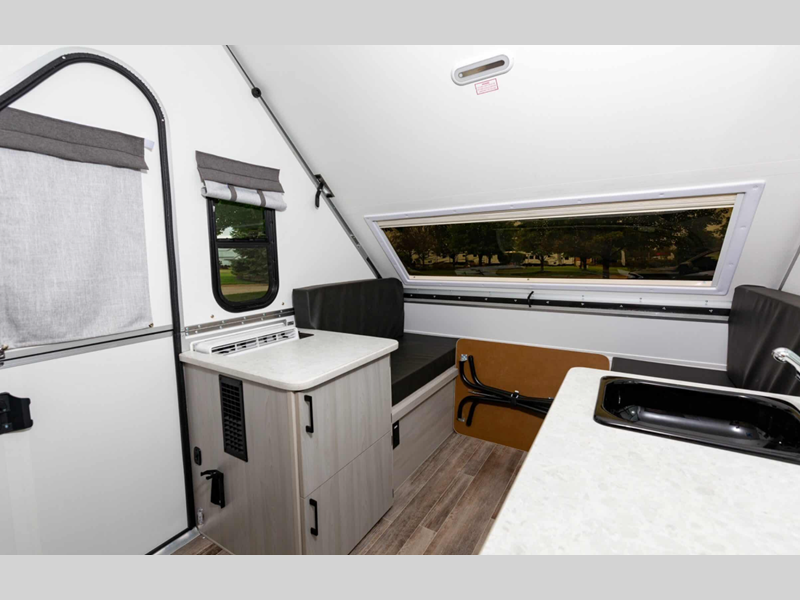 Each is built lightweight with an Azdel composite roof/sidewalls for added durability, and there are four stabilizer jacks for stability. The interior provides sleeping accommodations on a front bed or the converted dinette, a sink to wash up, and storage for your clothing, gear and such.